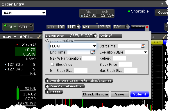 这个策略仅显示你想要的尺寸,和浮动的买价、中点、或出价,直到完成交易。输入一个显示的尺寸和选择一个等待、正常或积极执行。