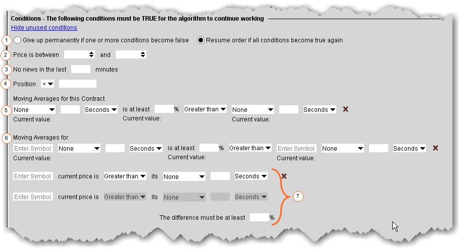 - 这三个区域一起工作,基于股票价格的不同和其移动平均来比较一个特定时间内两个股票价格的变化。算法基于您的输入完成计算。清除这些值, 点击行末端的‘X’。输入一个满足两个股票计算之间的差的百分比值。