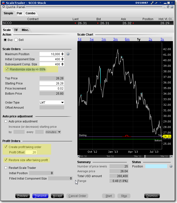 第一个400股组的提交价格是$26.28。在定单以这个价位被执行后,下一个400股的限价单将以$26.26的价格提交,同时相反边的400股获利兑现定单以$26.48(分组价格+获利抵消额)提交。