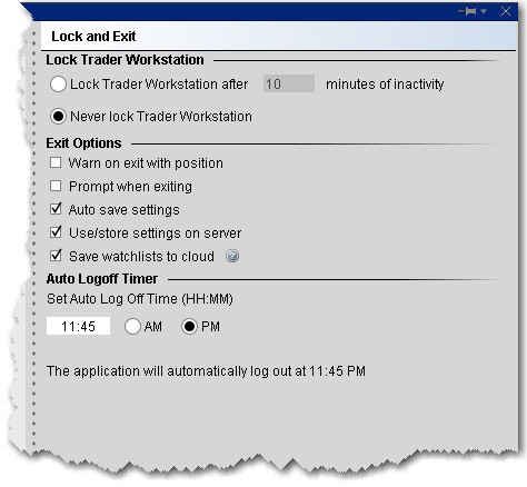 - 设定自动退出时间(Set Auto Log Off Time) - 为TWS%TRADE_SYSTEM_ACRONYM%指定日内的一个特定时间自动退出。你必须指定一个时间。