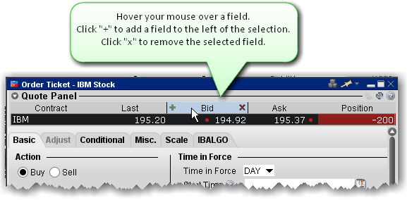 报价面板显示在独立的交易模块的顶部(例如定单标签,期权交易者,在册交易者,外汇交易者,市场深度交易者等等),并显示由标签指定的合约的市场数据。这个面板的工作方式和报价监控屏上的市场数据行类似,即当您点击买价时创建一个卖单,点击卖价创建一个买单。但不同于直接在市场数据行下创建定单,其定单是在定单面板上创建的。您可以添加或删除区域来自定义报价面板。