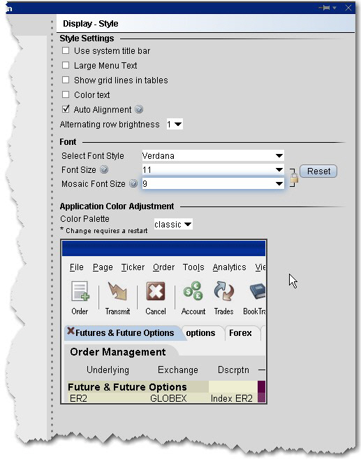 - 选择一个调色板对整个程序应用一个颜色基调。请注意,新的设置将在下一次登录时才被采用。 使用TWS%TRADE_SYSTEM_ACRONYM%图可查看你选择的样本显示。
