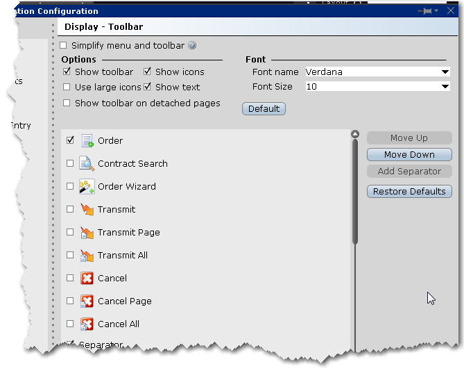 屏幕上的项目可以从交易工具栏上被添加/删除。使用右侧的上移和下移按钮改变按钮的顺序和分隔。使用删除按钮从工具栏上删除功能。使用添加分隔按钮在选择的工具栏功能上方添加一个分隔行。点击重设恢复所有删除的功能和分隔行。点击默认根据默认布局配置工具栏。
