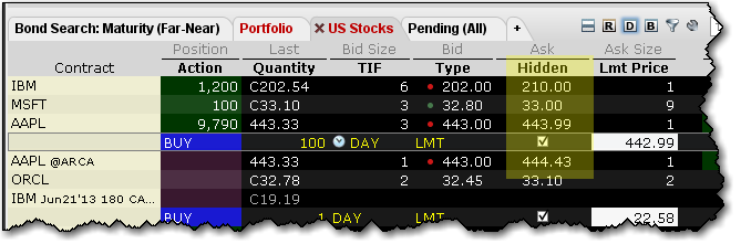 隐藏单(通常为大交易量定单)在市场数据或深度在册中均不显示其存在。