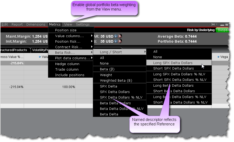 You can add one or multiple beta risk fields to your equity reports, but to enable beta weighting throughout the portfolio including the Risk Dashboard and P&L Graph, select Beta Weighted Portfolio from the View menu.