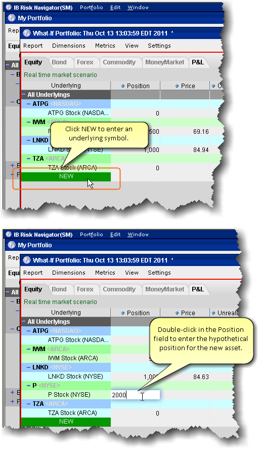 假设投资组合功能让您创建一个基于您真实投资组合的可编辑的、假想的投资组合。这允许您”改变“您的投资组合,包括添加、平仓、减少或增加头寸,查看风险状况如何改变。另外,您能够查看您投资组合的保证金要求。