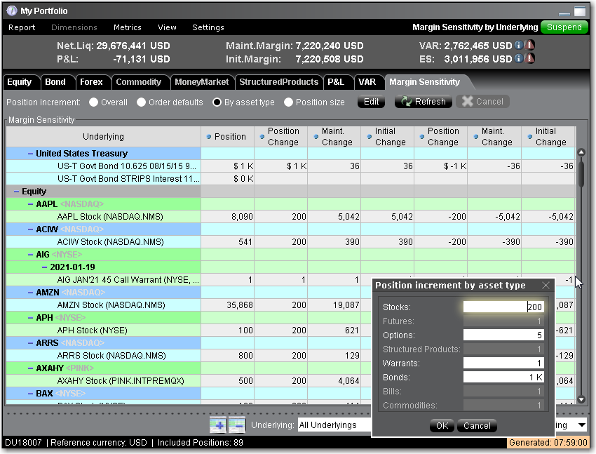 保证金敏感度报告(从VAR报告下一个报告标签进入)显示您的投资组合中头寸或一组头寸的增加或减少的保证金影响。