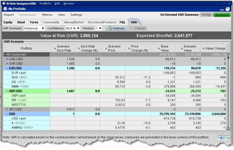 风险价值代表了正常生产条件下,在特定时间区间和基于置信水平定义的百分比概率的预期损失。这是一个理论值,并不代表潜在的最坏损失的情形。自选VaR报告计算整个投资组合的VaR。报告以子投资组合水平下计算VaR并在货币和投资组合水平下汇总。自选VaR也可以用于假设投资组合。将鼠标指向报告中栏名称查看详细信息。