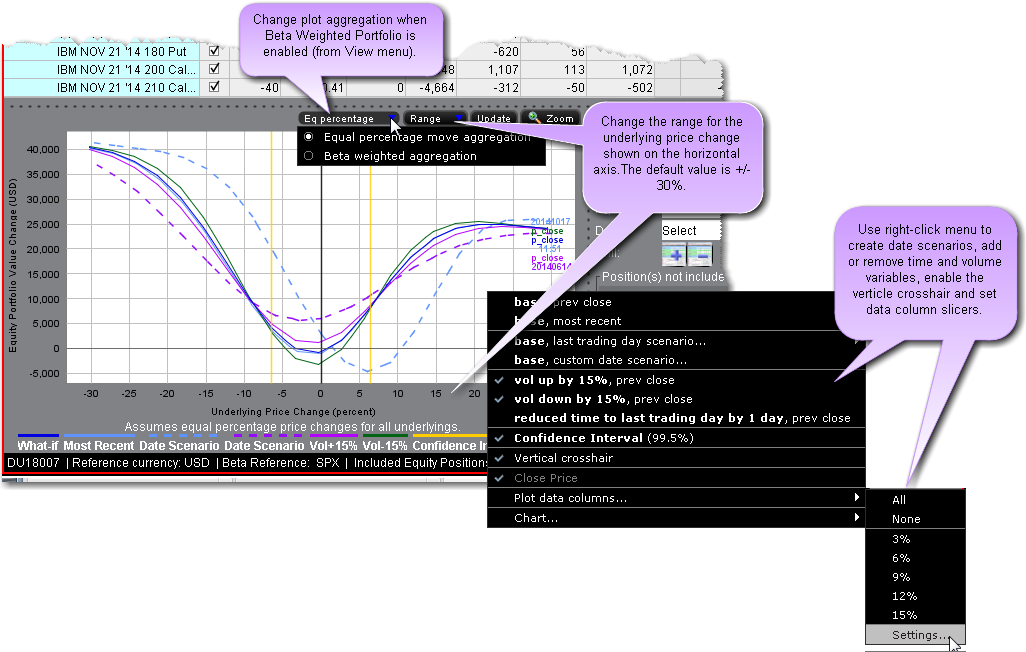 使用右键点击菜单中的波动率上升15%*,波动率下降15%* 和减少过期日1天复选框来查看不同情形下的图形,帮助您直观的观察您期权头寸的波动率和时间风险。您可以用前一天的收盘价和最新的变动价格显示基本益&损,波动率和时间变化永远基于前一天的收盘价。