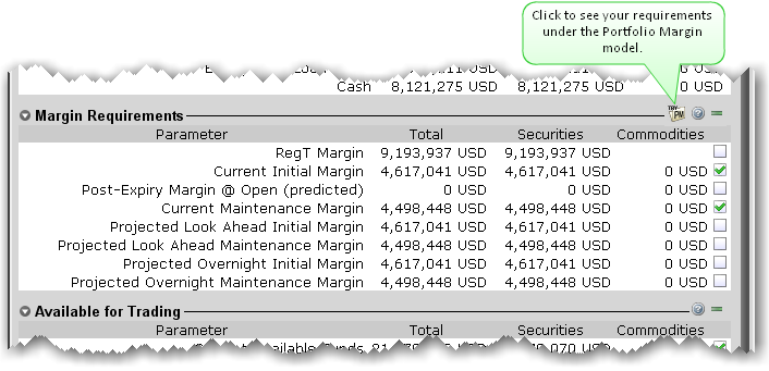 在投资组合保证金模式下查看你的保证金要求,点击Try PM 图标。投资组合保证金使用一个基于风险的模型,其可能会引起具有对冲头寸的平衡投资组合产生较低的保证金要求。现有客户可以通过账户管理升级到投资组合保证金账户。