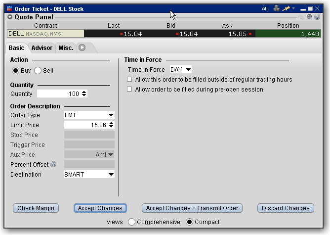 基本标签包括基本定单和有效时间,所有基于报价面板中显示的合约。区域与输入文字相关,也就是仅接受有效的选择。例如,如果你选择TRAIL LIMIT(跟踪限价)做为定单类型,则止损价、跟踪数量、和限价抵消区域即成为有效。另外,你在该页面上的选择将影响到标签组的组成。例如,如果你选择一个止损或跟踪定单类型,调整标签便成为可用的;如果你选择波动做为定单类型,则波动率标签将显示出来,等等。
