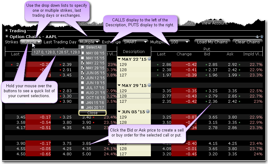 如果你选择一个执行价、过期日或交易所,按键标签将改变以显示该信息。如你选择了多个执行价、过期日或交易所,将你的鼠标指向按钮查看你选择的全部信息。