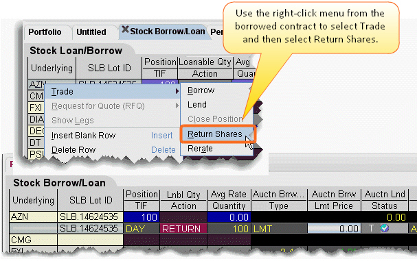 您借入了股票后,您可以使用返还定单功能返还股票,或贷方能够在任何时候召回股票。当借入的股票被召回是,将从您的账户中删除这些股票,并在