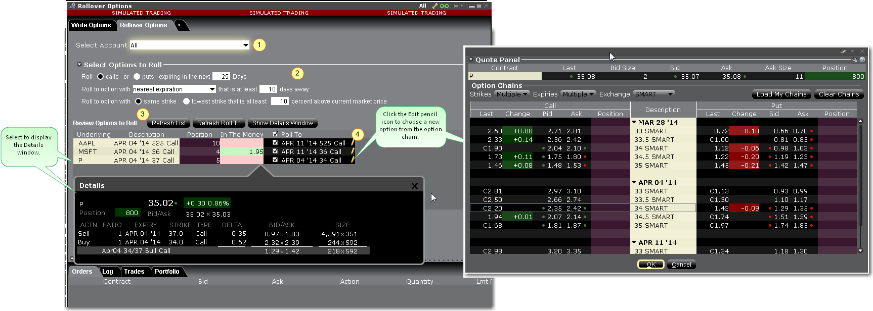 - 点击期权旁的铅笔图标打开期权链 和选择一个不同的期权买或卖。
