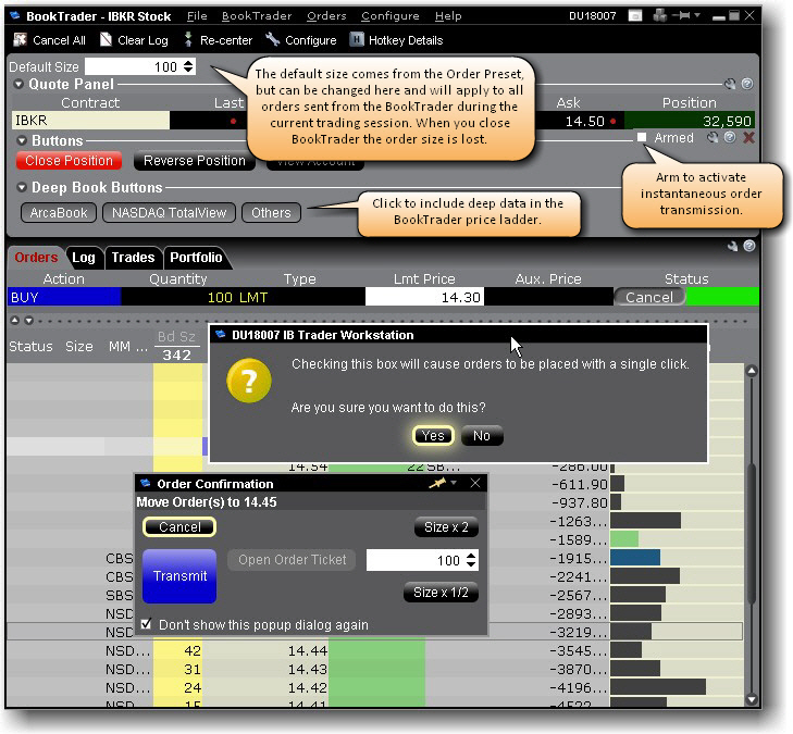 使用在册交易者进行交易,请点击价格阶梯上某个价格水平的买价尺寸或卖价尺寸。第一次发送定单时,你会被要求确认定单参数。 在这个确认框中,你可以选择不再显示确认框,如果你选择了不再确认,你的定单从此将会被即刻传递。