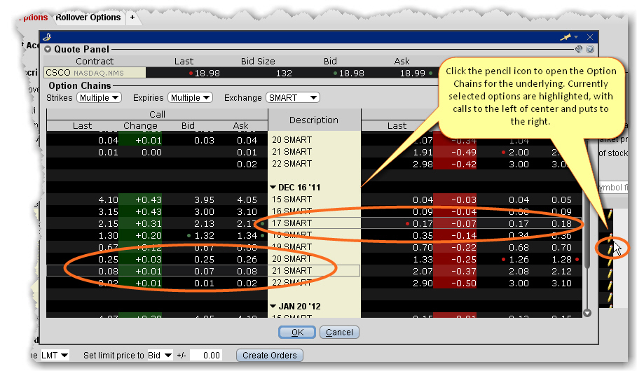 期权链窗口打开带有当前选择的控看涨和/或看跌合约。看涨显示在描述栏的左侧,看跌显示在右侧。