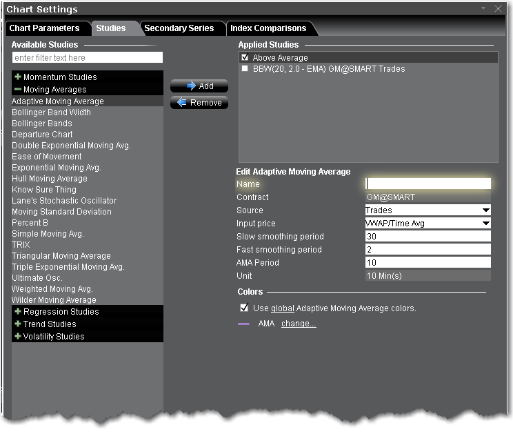 如同EMA,自适应移动平均(AMA)是另一个移动平均指标。其敏感性随价格的波动而改变。自适应移动平均当价格在某个确定方向移动时变得更敏感,当价格波动时变得对价格变动不敏感。