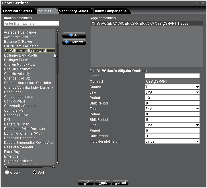 这个指标在鳄鱼线之外以线形图显示。鳄鱼震荡(Alligator Oscillator)包含了和鳄鱼指标相同的可配置区域,外加一个可调整指标图形高度的区域。