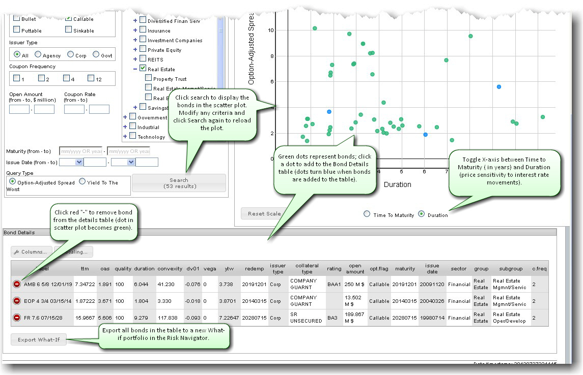 债券搜索的结果在散点图中得以呈现,其中,每个绿点代表满足指定条件的债券。