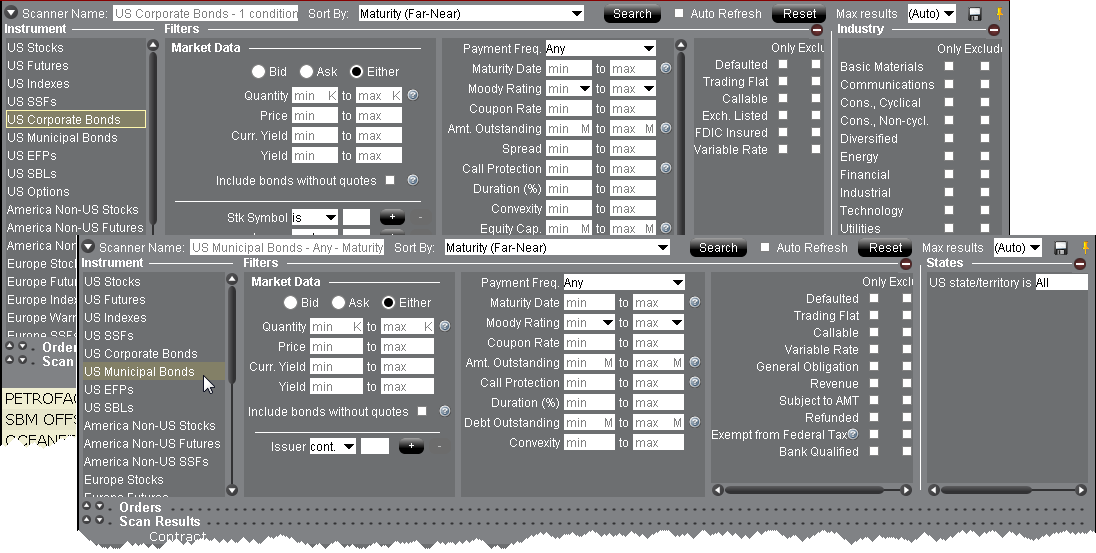 美国公司和美国市政债券扫描仪包括过滤器和适用于债券交易人特定需要的参数。