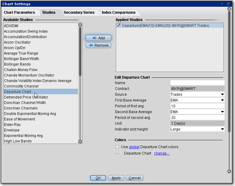 这是最老的技术指标之一,分离图(Departure Chart)测量两个价格移动平均之间的差;一个是做空,一个是做多。主要用于趋势识别工具,但也可以用于识别超买和超卖条件。默认区间是10和20.