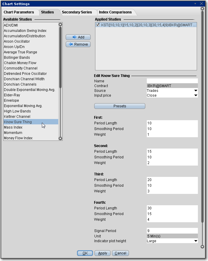 - KST线 = (RoCMA1 x 1) + (RoCMA2 x 2) + (RoCMA3 x 3) + (RoCMA4 x 4)
