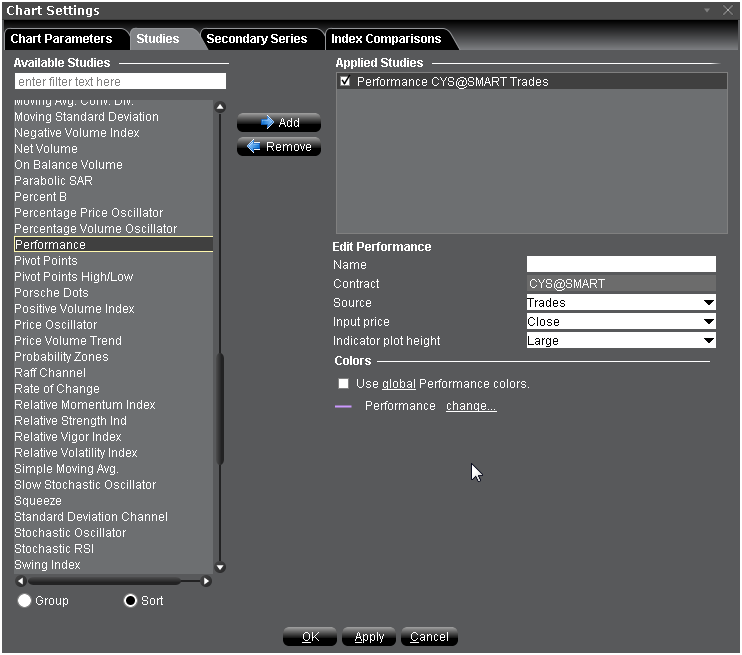 绩效指标以百分比显示一个证券的价格表现。有时也称之为“正常化的”图表。绩效指标显示自显示的第一个周期以来证券值增加的百分比。例如,如果绩效指标是10,代表证券的价格自图表左侧显示的第一个周期以来增加了10%。类似,负的-10%代表自显示的第一个周期以来证券的价格已经下跌了10%。绩效图表对比较不同证券的价格变化非常有用。