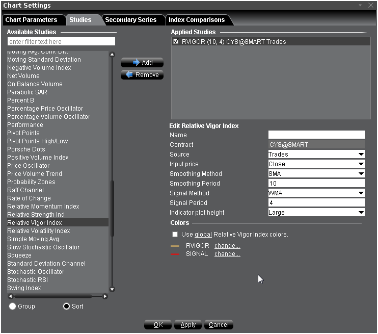 相对能量指数(Relative Vigor Index)衡量最近价格变动的定义,通过比较一个证券的收盘价相对于其价格范围的位置来发现其价格继续变化的可能性。通过计算值的指数平均值来平滑结果。类似于随机振荡,但能量指数(Vigor Index)将收盘价和开盘价进行比较,而不是和低价进行比较。该值可能随看涨趋势的增长而增长,因为证券的收盘价往往位于价格范围的顶部,而开盘价通常接近一天的低点。
