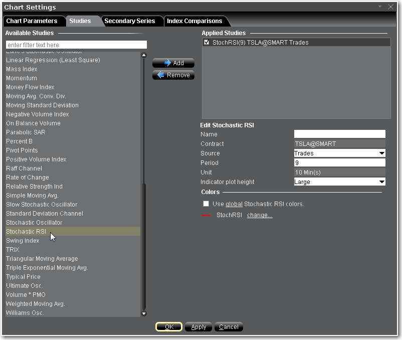 随机振动提供了关于当前收盘价处于相对于区间最高和最低价位置的信息。其范围是在0%到100%之间。读数为0%表示收盘价是之前x个时间段内证券交易的最低价。 读数为100%表示收盘价是之前x个时间段内证券交易的最高价。 该指标的RSI版本实质上将随机计算应用到相对强弱指标(RSI)。