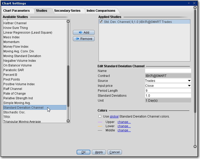 标准偏差通道(Standard Deviation Channel)是以设定数量的标准偏差围绕着一个线性回归线绘制的图形。可用于摇摆交易情形和发现动量的变化。