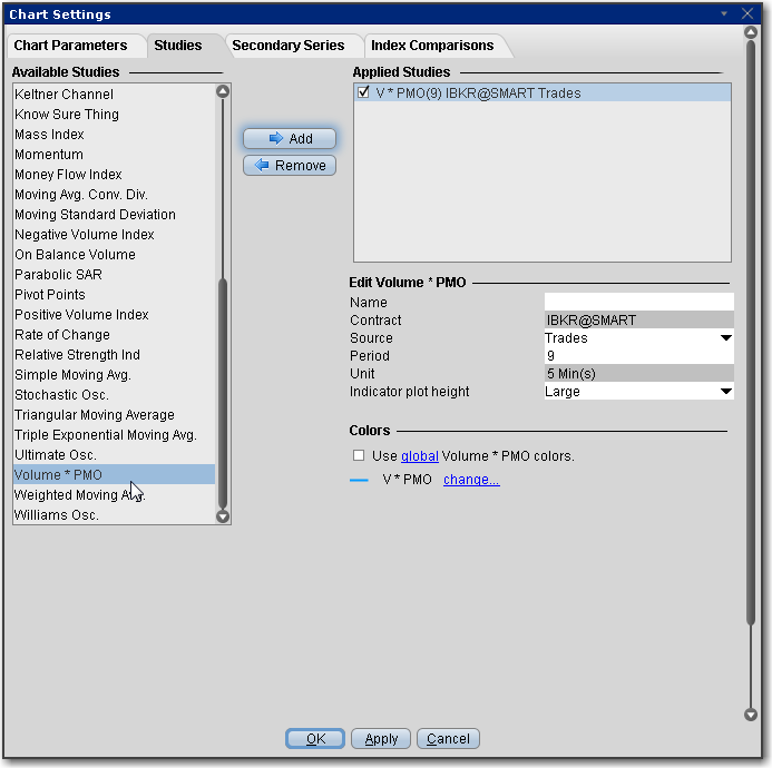 - 选取交易量*价格动量振荡(Volume * PMO)并点击添加将指标添加应用指标中。