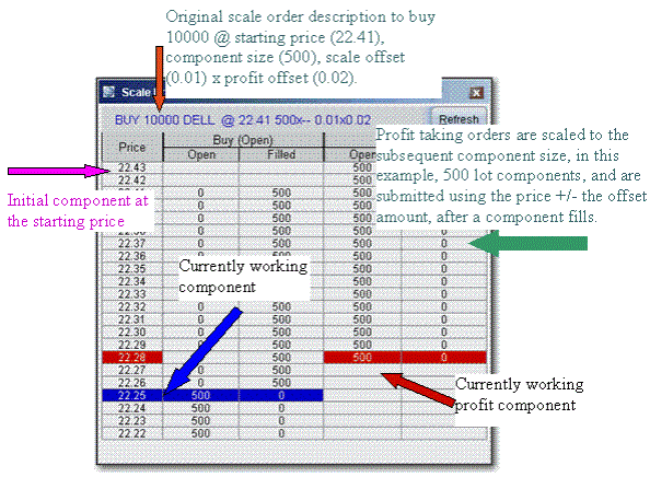 分段进程 框显示完整的分段价格阶梯、母分段定单的待执行/已执行分组列表,和子获利定单的待执行/已执行分组列表。