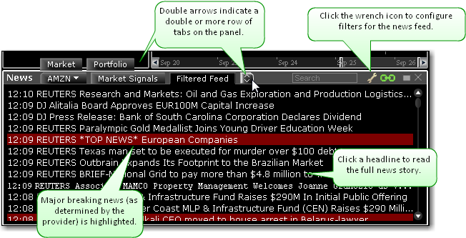 查看按您选取的主题筛选的实时输送的一般新闻。添加市场信号做为您组合新闻标题的一部分。注意,筛选的新闻窗口不能够成为链接窗口组中的窗口。