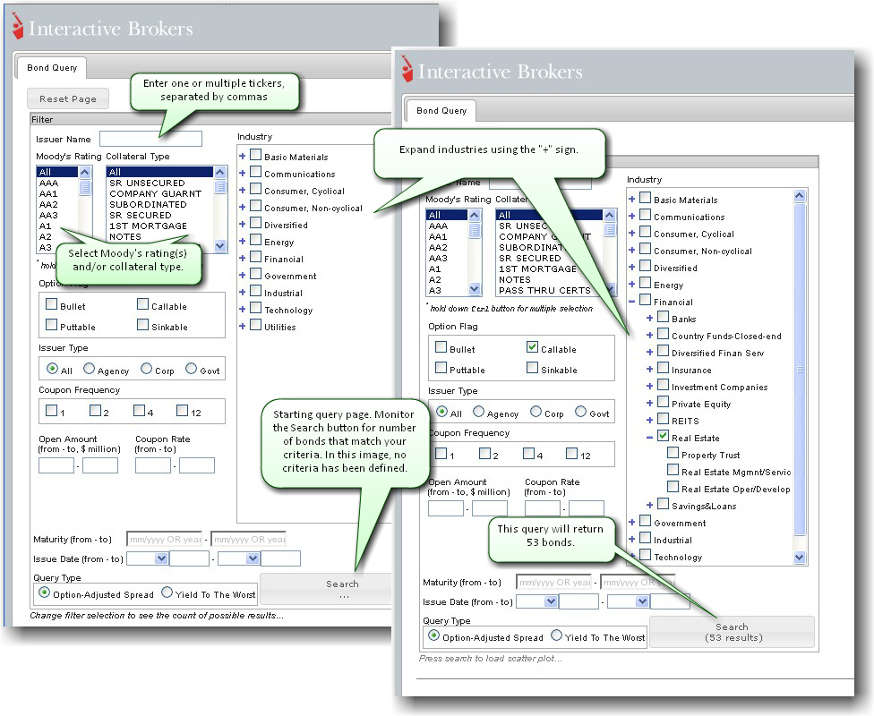 用户可以查询由代理机构,政府或公司发行的债券。使用这些字段来指定债券搜索条件(类似于扫描仪)。用户指定的条件越少,搜索结果给出的债券数量就会越大。用户必须指定至少一个条件才能开始搜索。