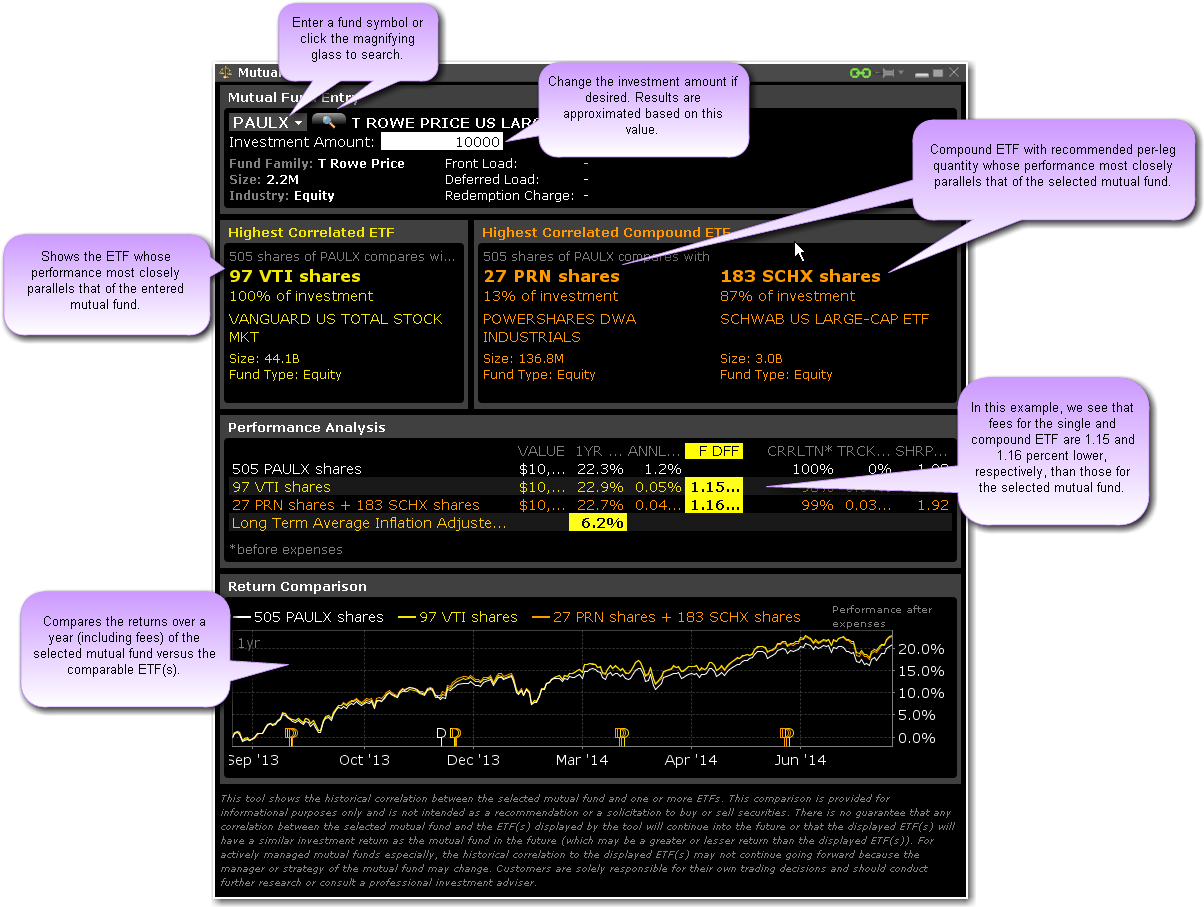 共同基金复制找出和用户指定的共同基金的表现相似的ETFs。在您输入了共同基金的名称或代码和投资数额后,复制扫描市场并给出和您提交的共同基金的表现最接近的按建议的数量的单个和组合ETFs(根据投资数额)。表现分析和回报比较面板显示表现相关特征,包括相关性、比较误差和管理费比较。