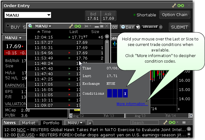 除了使用鼠标悬停功能外,您还可以选择给时间&销售窗口添加交易所和条件区域来显示交易条件(当存在时)。