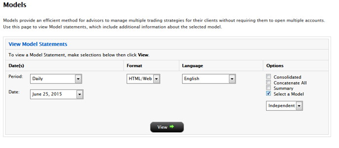 Models provide an efficient method for advisors to manage multiple trading strategies for their clients without requiring them to open multiple accounts. Client investments are allocated among instruments in the Model based on the Model's allocation ratios as defined by the advisor.
