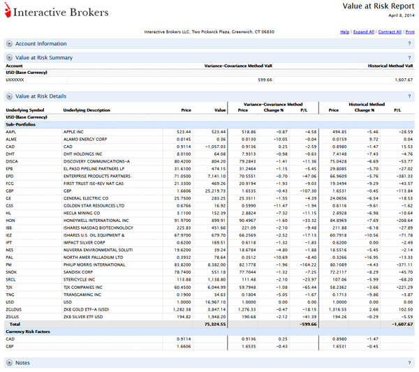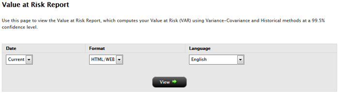Value at Risk is a number that represents an estimate of how much your portfolio may lose due to market movements for a particular time horizon and for a given confidence level (probability of occurrence). This report is completed overnight for a one-day horizon only. The report is based on account and, where applicable, sub-portfolios, and supports consolidated data for Advisor and Broker client accounts.
