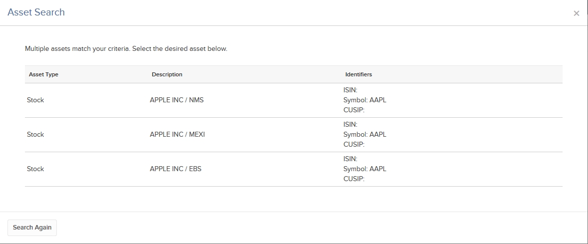 - In the Asset Search window, select an asset type from the drop-down. For example, select Stock.