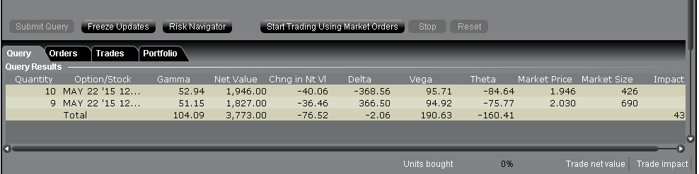 Freeze updates to the query to evaluate the solution, and use the IB Risk NavigatorSM to see how implementing the option portfolio will affect your current risk profile.