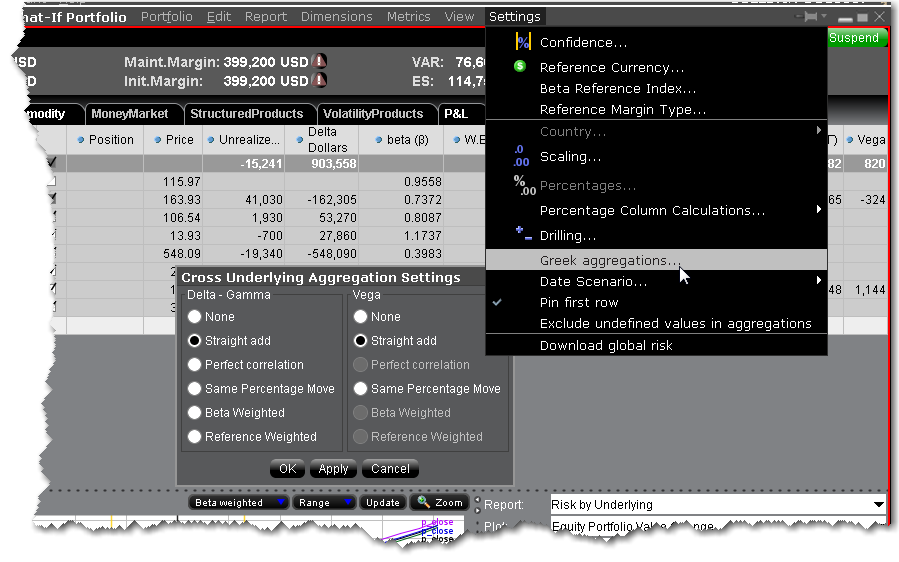 The aggregate calculations for the Delta, Gamma and Vega position Greeks can be changed from the Settings menu by choosing Greek aggregations.