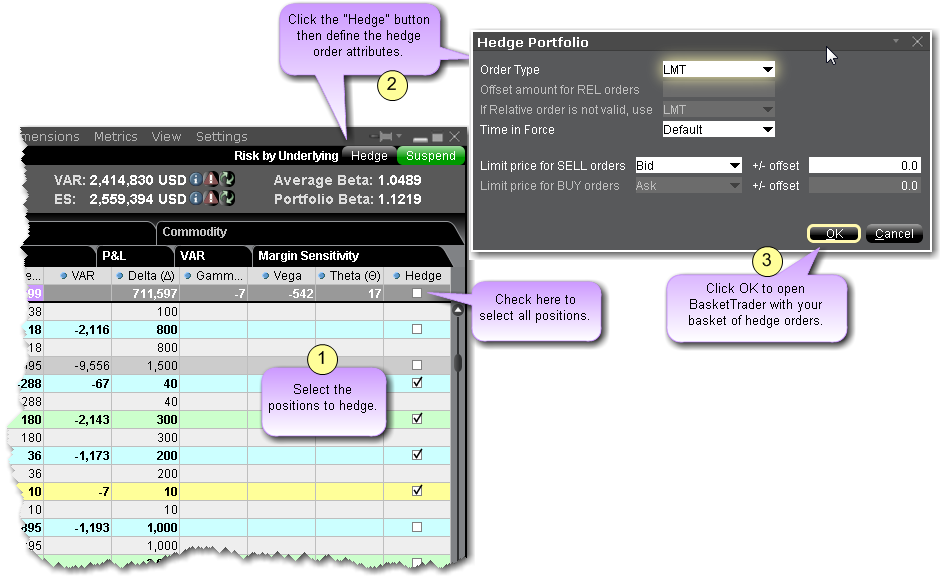 Display the Hedge metric on the Risk by Underlying and Risk by Industry reports to create a basket of delta hedge orders.