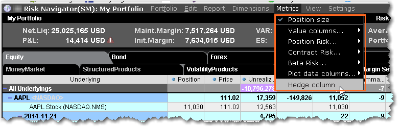 Note: If the feature is grayed out on the Metrics menu, it's not supported for that report. The Hedge checkbox functions at the aggregated level, and is only available in reports with a collapsible contract dimension, i.e. Risk by Underlying, Risk by Industry, Risk by Country, Plot Data by Underlying etc.