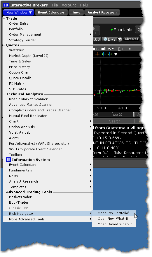 IB Risk Navigator report data refreshes automatically every 10 seconds, and immediately whenever an order executes, for all reports except the Measure by Price Change and Volatility Change. This report uses prices from the close of the previous business day and calculates market outcome risk by advancing the time parameter to the close of the next business day.