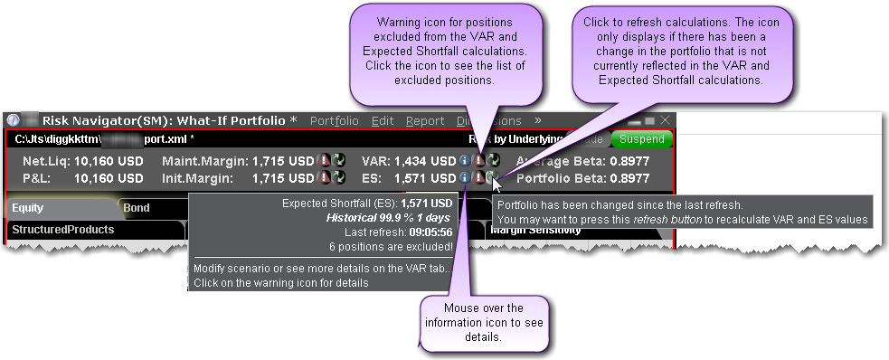 | VAR | Shows the Value at Risk for the entire portfolio. VAR is a measure of the largest anticipated loss over a specified time period and confidence level, where the confidence level provides the probability that the VAR measure will not be exceeded. |