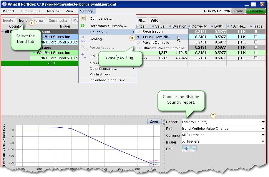 The Risk by Country report sorts positions by country-related attributes that you specify from the Risk Navigator Settings menu.