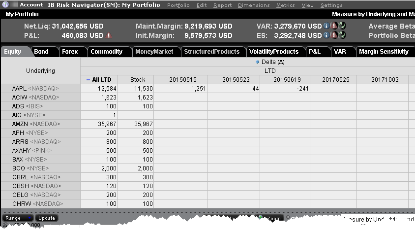 The Measure by Underlying and Maturity matrix displays risk by measure for all underlyings, sorted by Last Trading Day. The measure, which you selected in the Measure dropdown of the Report Selector, is displayed along the top of the matrix. The Last Trading Day fields display the sum of all positions (measures) for the given underlying/LTD.