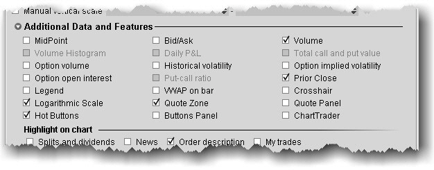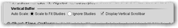 A vertical buffer makes the price range on a chart larger than necessary to give extra space at the top and bottom of the actual chart. When you add a vertical buffer, the chart automatically scales to accommodate a wider price range. You can elect to: