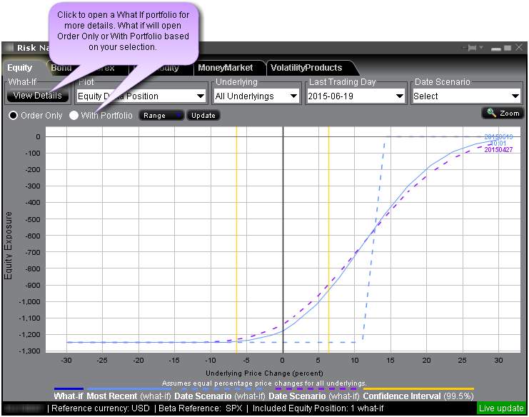 To view a complete What-If scenario in Risk Navigator comprised of all current positions plus whatever trades you are considering, ensure that "With Portfolio" is selected, and then click the View Details button in the top left corner.
